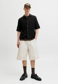 Νέος άνδρας που φοράει καφέ καπέλο, μαύρο κοντομάνικο πλεκτό πουκάμισο με κουμπιά πάνω από καφέ μπλούζα και ανοιχτόχρωμο παντελόνι, όρθιος με τα χέρια πίσω από την πλάτη.