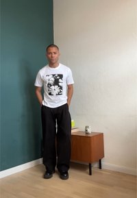 • Άνδρας που φοράει λευκό μπλουζάκι με μεγάλο μαύρο γεωμετρικό κείμενο "KARL LAGERFELD" και σκούρο τζιν, στέκεται μπροστά σε απλό ανοιχτό γκρι φόντο.