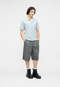 Νέος με μεσαίου μήκους σκούρα μαλλιά φοράει γαλάζιο κοντομάνικο πλεκτό πόλο πουκάμισο και φαρδιά γκρι παντελόνια, στέκεται μπροστά σε λευκό φόντο.