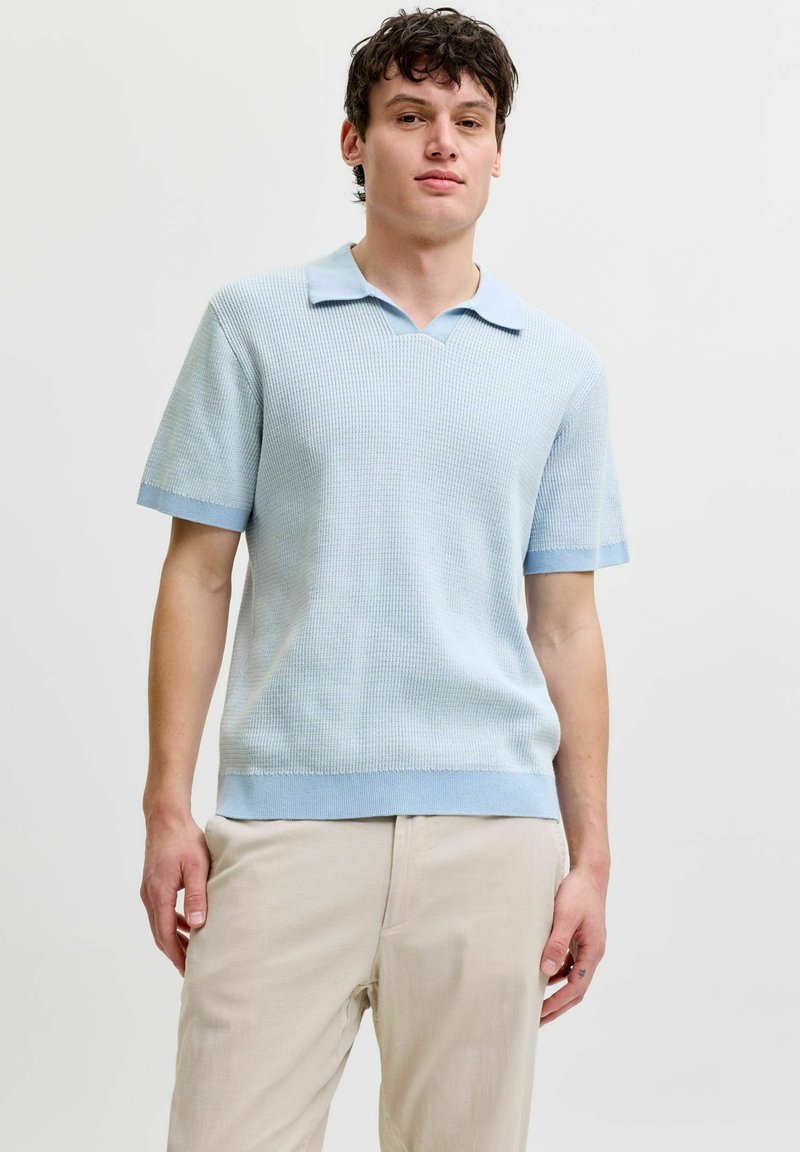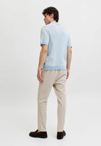 Νέος άνδρας στέκεται, φοράει ένα ανοιχτό μπλε κοντομάνικο πλεκτό πόλο και μπεζ παντελόνια, με ουδέτερη έκφραση σε απλό φόντο.
