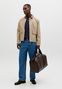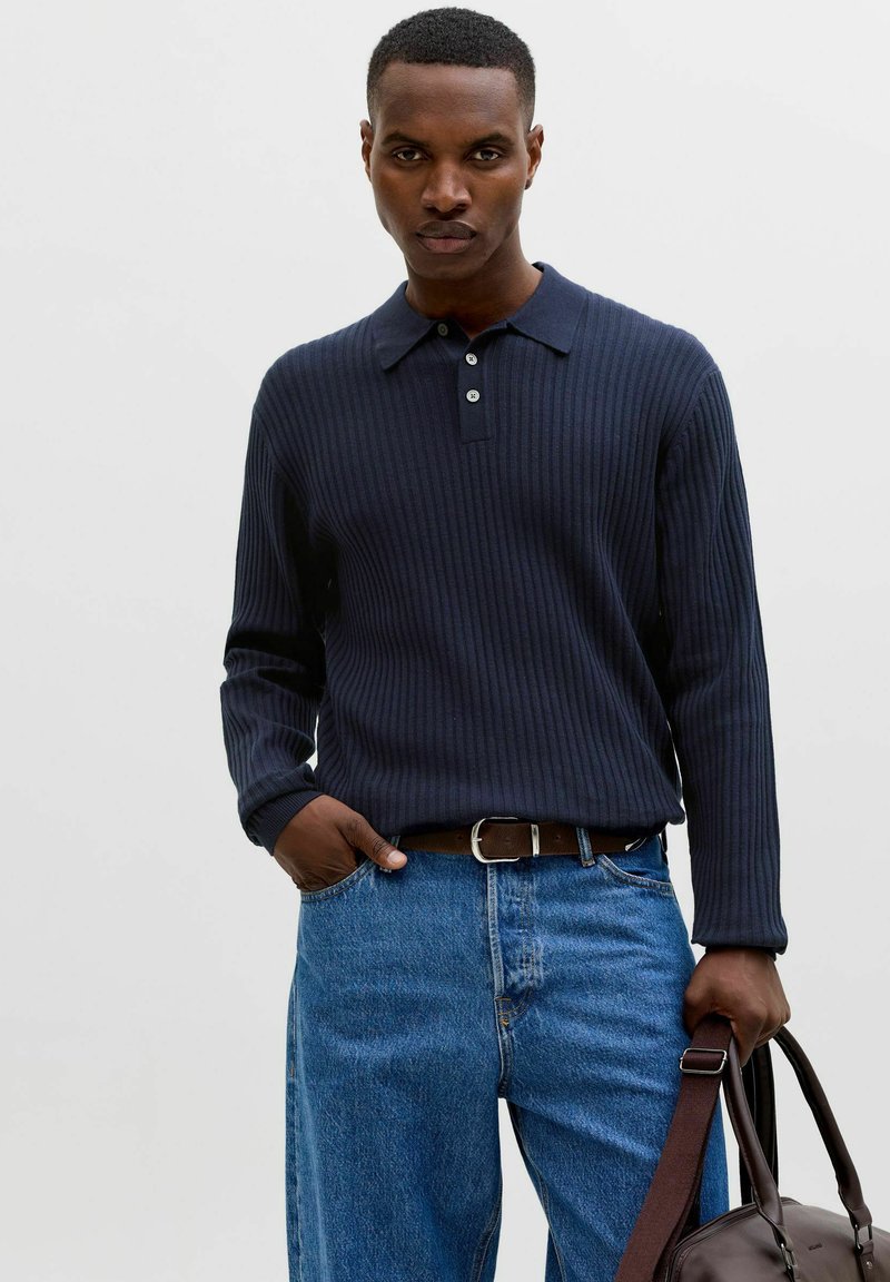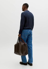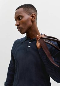 Άνδρας με σκούρο μπλε ριγωτό πόλο με μακριά μανίκια και μπλε τζιν, κρατώντας μια καφέ δερμάτινη τσάντα με το δεξί χέρι.