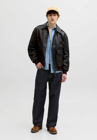 Άνδρας που φοράει σκούρο μπλε τζιν σε ίσια γραμμή, καφέ δερμάτινα μπότες, γαλάζιο πουκάμισο και σκούρο καφέ δερμάτινο μπουφάν, στέκεται με τα χέρια χαλαρά.