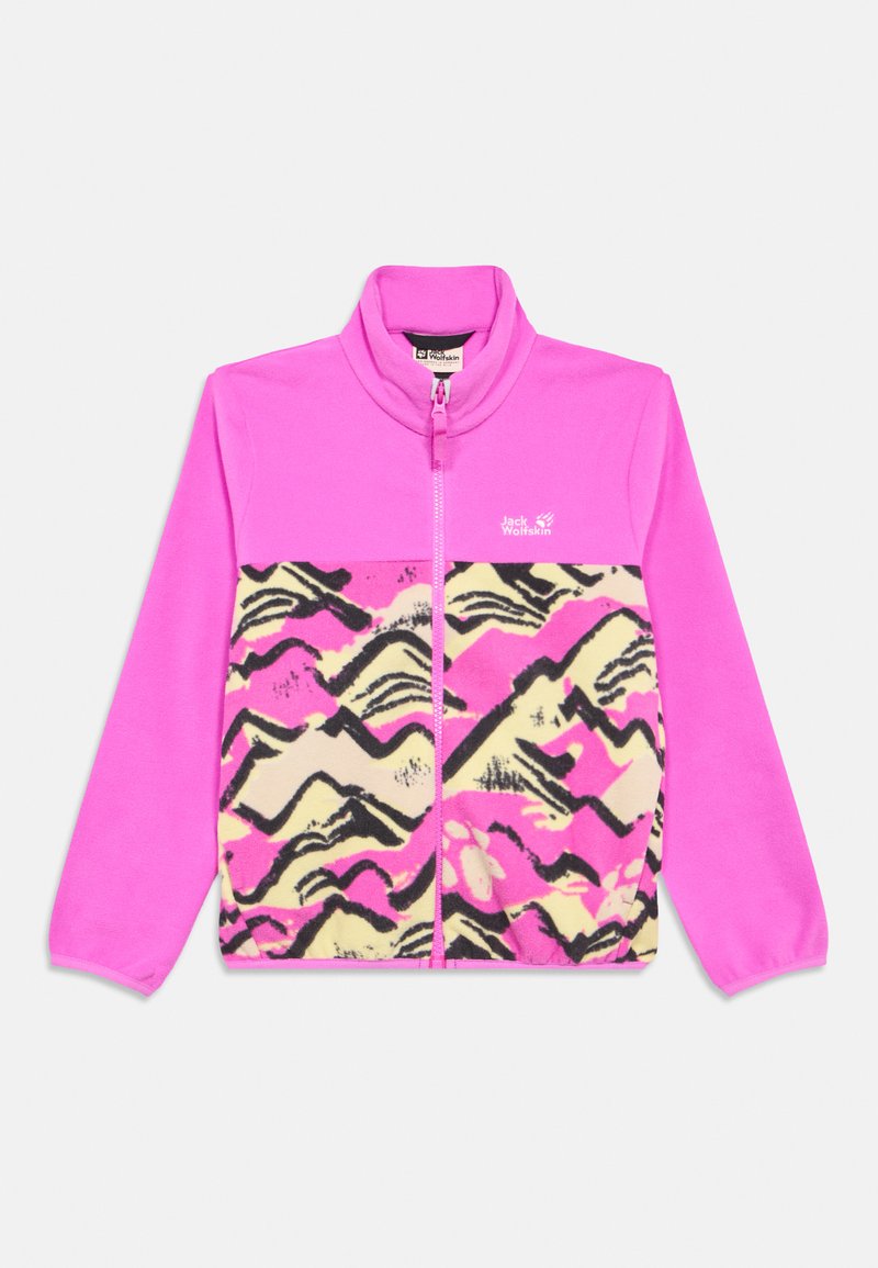 Ροζ φλις μπουφάν με ψηλό γιακά, πλήρες φερμουάρ και διακοσμημένο κάτω μέρος με μαύρα και ροζ κυματιστά σχέδια.
