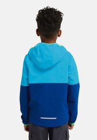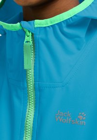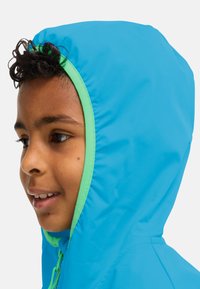 Μπλε και ναυτικό τζάκετ αδιάβροχα με πράσινες λεπτομέρειες, διαθέτουν πλήρη φερμουάρ, ενσωματωμένες κουκούλες και πλαϊνές τσέπες με φερμουάρ.