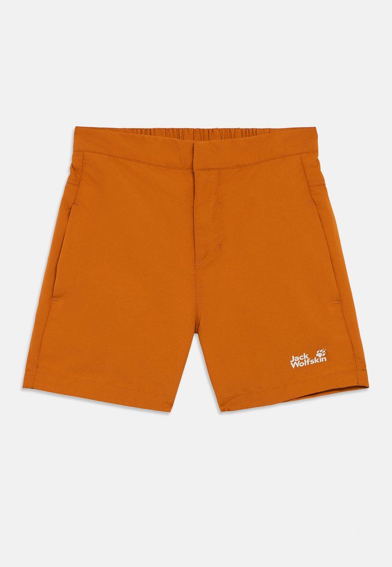Παντελόνια σορτς εξωτερικού χώρου σε έντονο πορτοκαλί χρώμα με ελαστική μέση, πλαϊνές τσέπες και λευκό λογότυπο Jack Wolfskin στο αριστερό πόδι.
