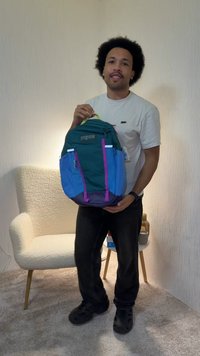 Μπλε και βεραμάν σακίδιο με κίτρινους ιμάντες, δίχτυ στις πλευρικές τσέπες και μπροστινό λογότυπο. Λείο ύφασμα και γωνιώδης βάση.