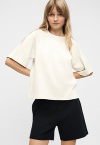 Νεαρή γυναίκα με ξανθά ώμου μήκος μαλλιά, ντυμένη με εκρού κοντομάνικη μπλούζα και μαύρο σορτς, στέκεται μπροστά σε απλό φόντο.