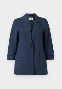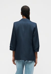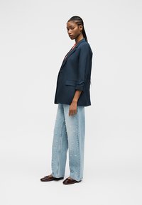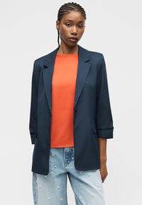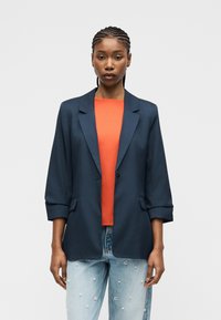 Γυναίκα με πλεξούδες που φοράει μπλε σακάκι πάνω από πορτοκαλί πουκάμισο και ανοιχτόχρωμα τζιν με διακοσμήσεις από πέρλες, στέκεται μπροστά σε απλό φόντο.