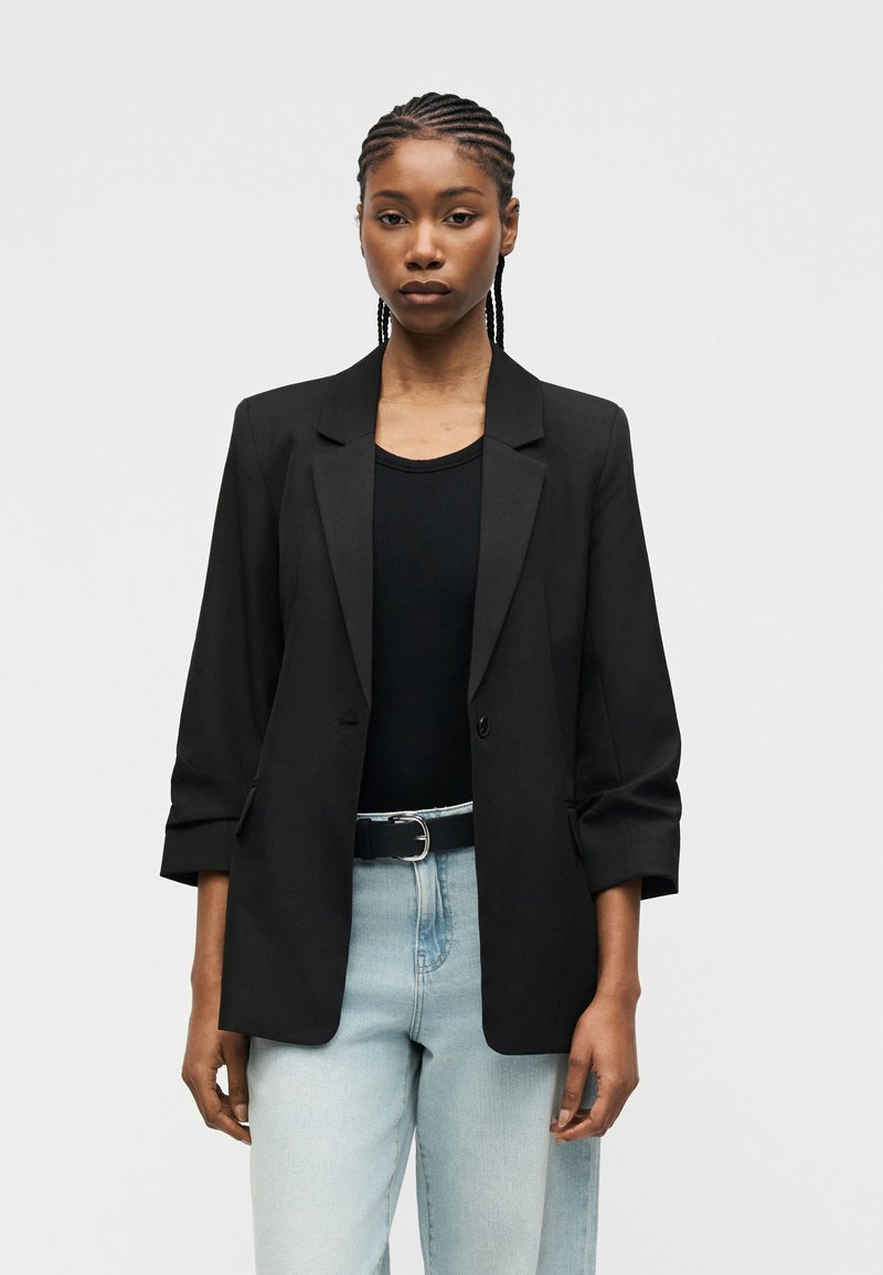 Νεαρή γυναίκα αφρικανικής καταγωγής με πλεκτά μαλλιά, φορώντας μαύρο σακάκι πάνω από μαύρο τοπ και ανοιχτόχρωμο τζιν με μαύρη ζώνη, στέκεται μπροστά σε ουδέτερο φόντο.
