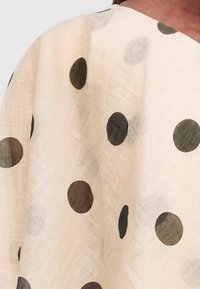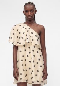 Γυναίκα με κοτσίδες που φοράει μια μπεζ φόρεμα με ένα ώμο και μαύρες πουά, στέκεται μπροστά σε απλό λευκό φόντο.
