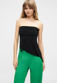 Γυναίκα που φοράει φωτεινό πράσινο παντελόνι με φαρδιά πόδια, μαύρο τοπ και μαύρες μυτερές γόβες σε λευκό φόντο.