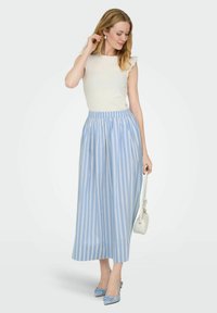 Απαλή μπλε ριγέ μακριά φούστα με ελαστική μέση, λεία υφή, φτάνει μέχρι τους αστραγάλους, συνδυασμένη με λευκή τσάντα και μπλε ψηλές γόβες.