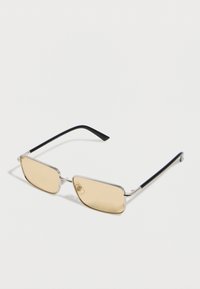 Ορθογώνια γυαλιά ηλίου με ασημένιους μεταλλικούς σκελετούς, φακούς ανοιχτού κεχριμπαριού και μαύρα βραχίωνα ναών, πάνω σε λευκό φόντο.