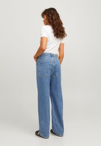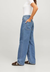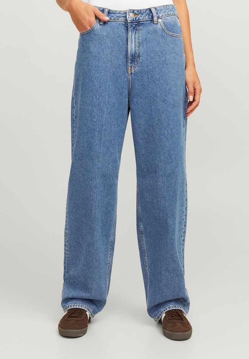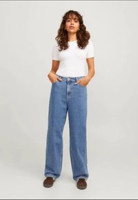 Ανοιχτό μπλε, τζιν παντελόνι φαρδιάς γραμμής με ψηλή μέση, πέντε τσέπες και ακατέργαστο χείλος. Συνδυασμένο με σκούρα καφέ σουέτ αθλητικά παπούτσια.