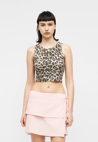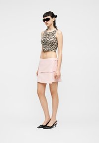 Γυναίκα με αμάνικο crop top με λεοπάρ σχέδιο, ανοιχτό ροζ δερμάτινη φούστα τύπου wrap, μαύρες γόβες με λουράκι στο πίσω μέρος και υπερμεγέθη μαύρα γυαλιά ηλίου, στέκεται πλαγίως.