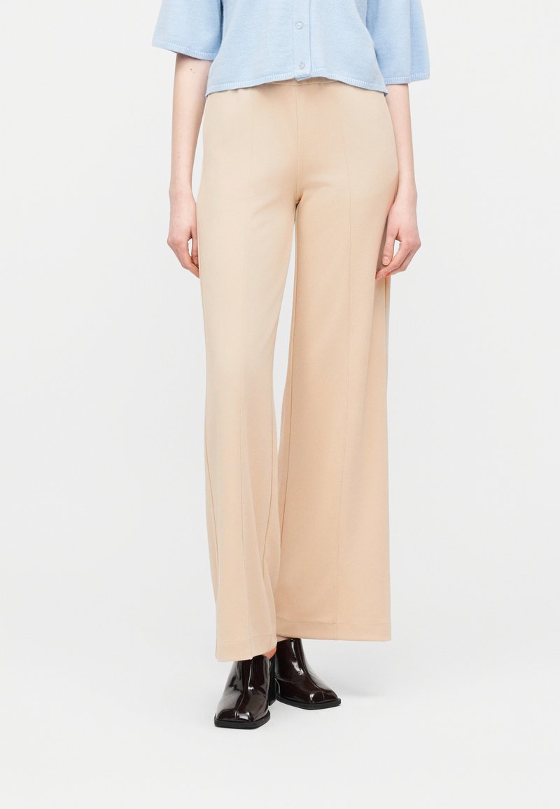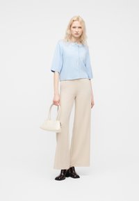 Γυναίκα που φοράει μπεζ παντελόνια με φαρδιά μπατζάκια, ανοιχτό γαλάζιο cropped πουλόβερ με κουμπιά και λαμπερές μαύρες μποτάκια μέχρι τον αστράγαλο, στέκεται μπροστά σε απλό φόντο.