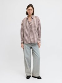 Νεαρή γυναίκα που φοράει μια φαρδιά καφέ και ροζ καρό πουκαμίσα με κουμπιά, με τα μανίκια σηκωμένα, και ανοιχτόχρωμα μπλε τζιν, στέκεται μπροστά σε λευκό φόντο.