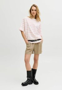Ξανθιά γυναίκα που φοράει λευκό, φαρδύ μπλουζάκι με ροζ ρίγες, μπεζ σορτς και μαύρη ζώνη, στέκεται μπροστά σε απλό ανοιχτό φόντο.