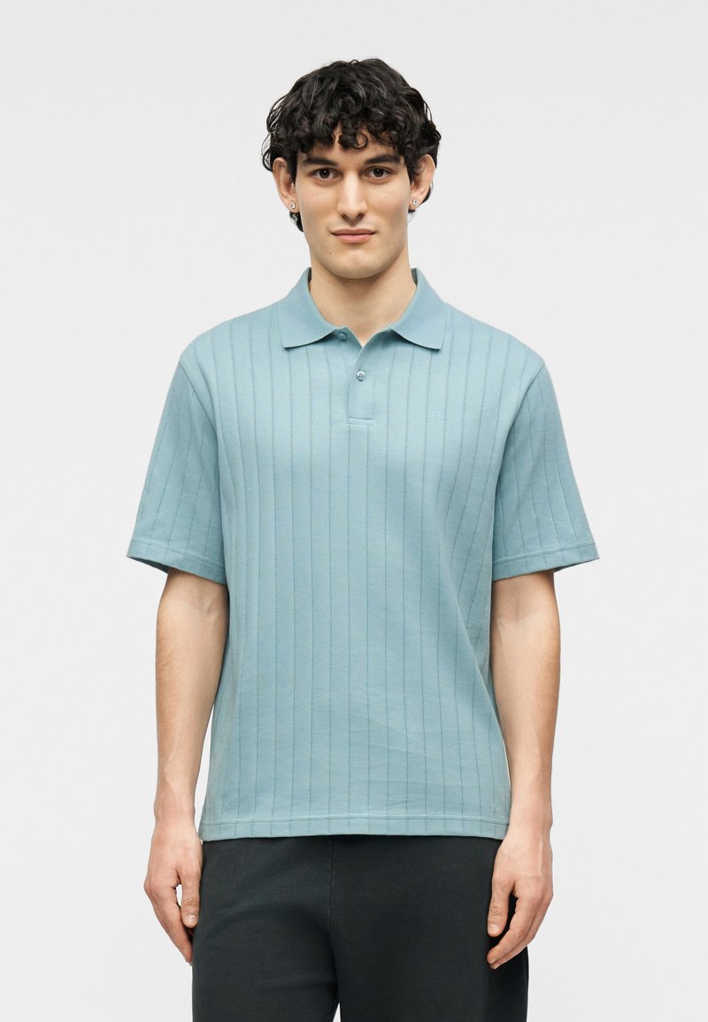 Ανοιχτό μπλε ριμπ πουκάμισο πόλο με κάθετες ρίγες και μικρό ανυψωμένο λογότυπο στο αριστερό στήθος, κουμπωμένο κοντά στον γιακά.