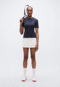Αθλητική μπλούζα ναυτικού χρώματος με κοντά μανίκια, στρογγυλή λαιμόκοψη και μικρό λευκό λογότυπο. Συνδυασμένη με λευκή φούστα που έχει μαύρο λογότυπο.