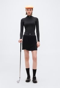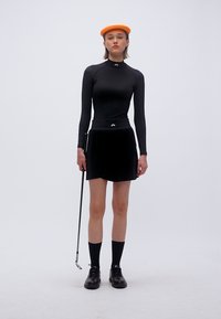 Γυναίκα που φοράει μαύρη πιετέ φούστα με ζώνη, μαύρο μακρυμάνικο τοπ, μαύρες κάλτσες μέχρι τον αστράγαλο και μαύρα δερμάτινα παπούτσια με κορδόνια σε λευκό φόντο.