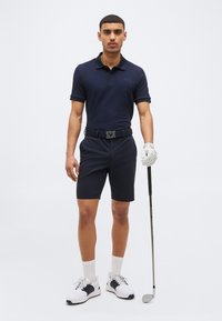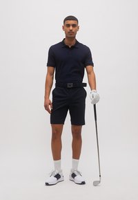 Νεαρός άνδρας με κοντά μαλλιά, φορώντας στενή σκούρα μπλε μπλούζα πόλο και σκούρο παντελόνι, στέκεται μπροστά σε απλό ανοιχτό φόντο.