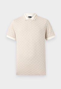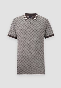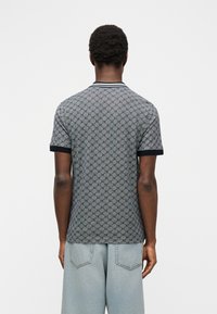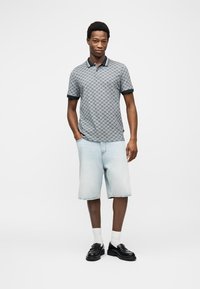 Νεαρός άνδρας όρθιος, φοράει γκρι πουά πόλο με μαύρο γιακά και μανσέτες, και ανοιχτό μπλε τζιν, μπροστά σε λευκό φόντο.