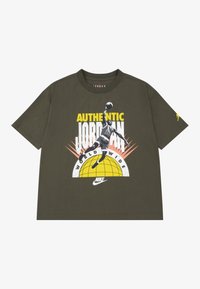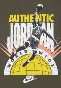 Πράσινο λαδί βαμβακερό t-shirt με κοντά μανίκια, με γραφικό ενός παίκτη που πηδάει. Το κείμενο γράφει "AUTHENTIC JORDAN WORLDWIDE" και "NIKE."