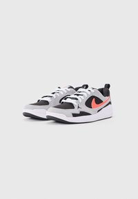Χαμηλό αθλητικό παπούτσι σε μαύρο και γκρι με λευκή σόλα και κοραλλί λογότυπο Nike, απεικονίζεται σε απλό φωτεινό φόντο.