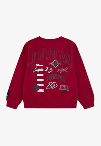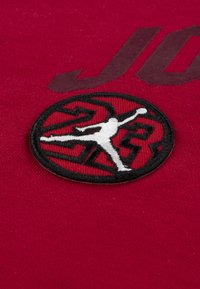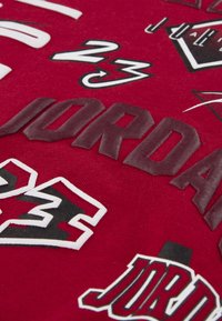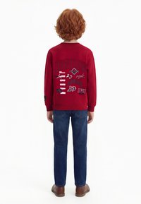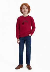 Αγόρι με κόκκινα μαλλιά που φοράει κόκκινο φούτερ Jordan, μπλε τζιν και καφέ παπούτσια, στέκεται με το ένα χέρι στην τσέπη μπροστά σε λευκό φόντο.