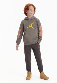 Αγόρι με κόκκινα μαλλιά που χαμογελά, φοράει γκρι και πορτοκαλί φούτερ με κουκούλα με κίτρινο λογότυπο μπάσκετ, ταιριαστό παντελόνι και μπεζ ψηλά αθλητικά παπούτσια, στέκεται χαλαρά.