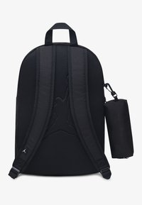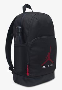 Μαύρο σακίδιο πλάτης με κόκκινο λογότυπο Jumpman μπροστά και το κείμενο "AIR", που διαθέτει κυλινδρική θήκη στο πλάι με την ετικέτα "JORDAN".