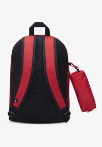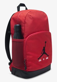 Κόκκινο και μαύρο σακίδιο πλάτης με μπροστινή τσέπη, μαύρο λογότυπο "Air Jordan" και προσαρτημένη κυλινδρική κόκκινη θήκη με το κείμενο "Jordan" σε μαύρο χρώμα.