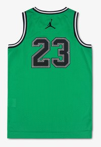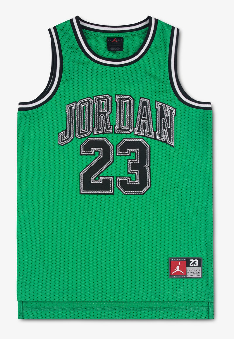 Πράσινη φανέλα μπάσκετ με μαύρη και λευκή διακόσμηση, το κείμενο «JORDAN 23» σε μαύρο και λευκό, και ένα κόκκινο και μαύρο λογότυπο Jumpman στο τελείωμα.