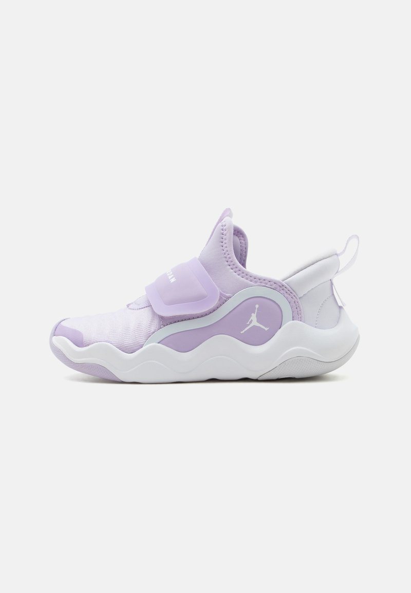 Αθλητικό παπούτσι σε ανοιχτό μωβ και λευκό χρώμα, χωρίς κορδόνια, με μαξιλαρωμένο πέλμα, ελαστικό λουράκι στο πάνω μέρος και το λογότυπο Jumpman στην πλαϊνή πλευρά.