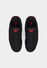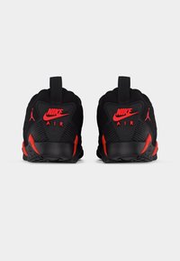 Μαύρο και κόκκινο χαμηλού προφίλ παπούτσι Air Jordan με πλευρικά πάνελ από πλέγμα, κορδόνια στο μπροστινό μέρος και ξεχωριστό σχεδιασμό στη μεσαία σόλα, σε ουδέτερο φόντο.