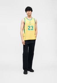 Νέος άνδρας που φοράει κίτρινη φανέλα μπάσκετ της Βραζιλίας με αριθμό 23 και πράσινη επένδυση, στέκεται μπροστά σε ένα απλό φωτεινό φόντο.