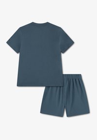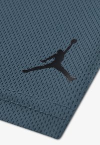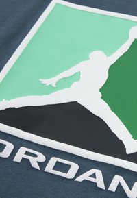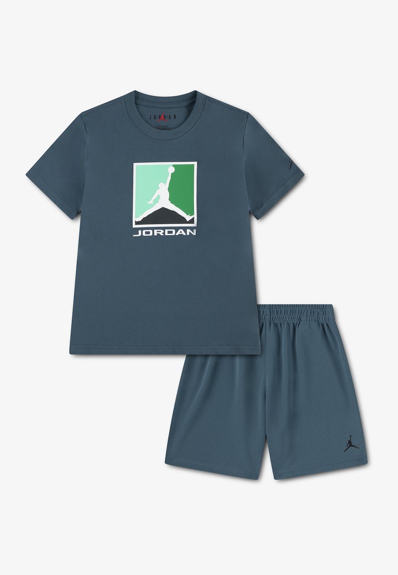 Σετ της μάρκας Jordan σε σκούρο μπλε, που περιλαμβάνει κοντομάνικη μπλούζα με το λογότυπο Jumpman σε πράσινο και μπλε, συνδυασμένη με σορτς με ελαστική μέση στο ίδιο χρώμα.