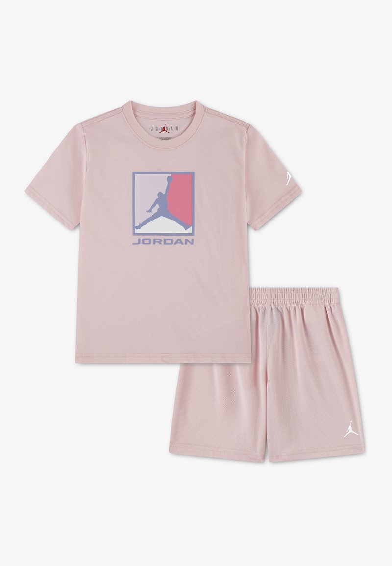 Ανοιχτό ροζ παιδικό σετ Jordan με κοντομάνικο μπλουζάκι που φέρει το λογότυπο Jumpman και αντίστοιχα δίχτυ μπλουζάκια με το λογότυπο Jumpman.
