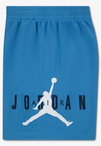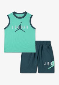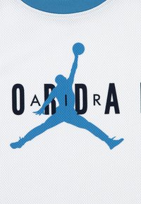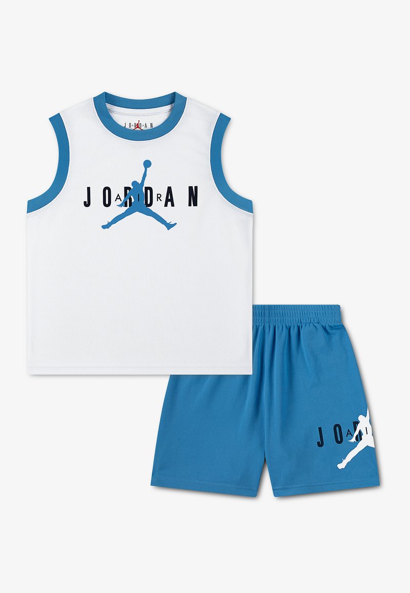 Αμάνικη λευκή μπασκετική φανέλα με μπλε λεπτομέρειες και λογότυπο Jordan, σε συνδυασμό με μπλε σορτς που φέρουν μικρότερο λογότυπο Jordan.