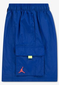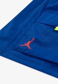 Μπλε αθλητικά σορτς με ελαστική μέση, μαύρο κορδόνι, διπλές πλαϊνές τσέπες cargo και κόκκινο λογότυπο Jordan στην δεξιά τσέπη.