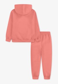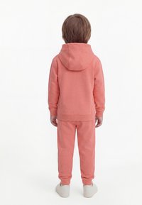 Νεαρό παιδί που χαμογελά, φοράει κοραλλί φούτερ με κουκούλα και αντίστοιχο παντελόνι φόρμας με λευκά αθλητικά παπούτσια, στέκεται μπροστά σε ένα απλό λευκό φόντο.