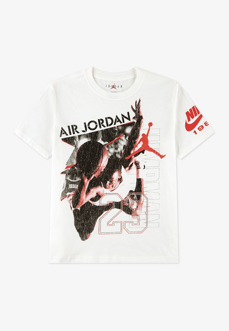Άσπρο βαμβακερό μπλουζάκι με γραφικό τύπωμα που απεικονίζει στοιχεία καλαθοσφαίρισης, κείμενο «AIR JORDAN», αριθμό «23» και λογότυπο «NIKE» σε κόκκινο χρώμα.