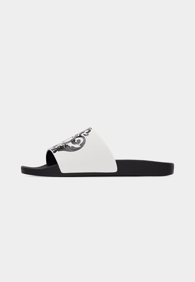 Μαύρο σανδάλι slide με φαρδιά λευκή λωρίδα που φέρει μαύρο περίτεχνο σχέδιο σπειροειδούς διακόσμησης, εμφανιζόμενο πάνω σε απλό φωτεινό φόντο.
