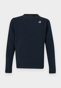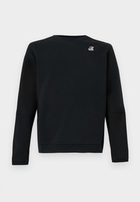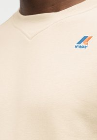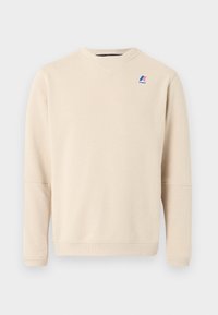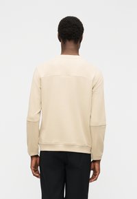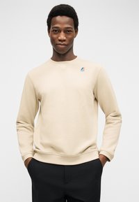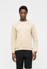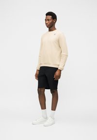 Νεαρός άνδρας που φοράει μπεζ μακρυμάνικη φούτερ με μικρό λογότυπο στο στήθος και μαύρα σορτς, στέκεται μπροστά σε απλό φόντο.