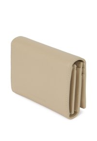 Μπεζ δερμάτινο πορτοφόλι με κεντημένο αφηρημένο λογότυπο στην μπροστινή πτέρυγα, τοποθετημένο πάνω σε απλό φωτεινό γκρι φόντο.