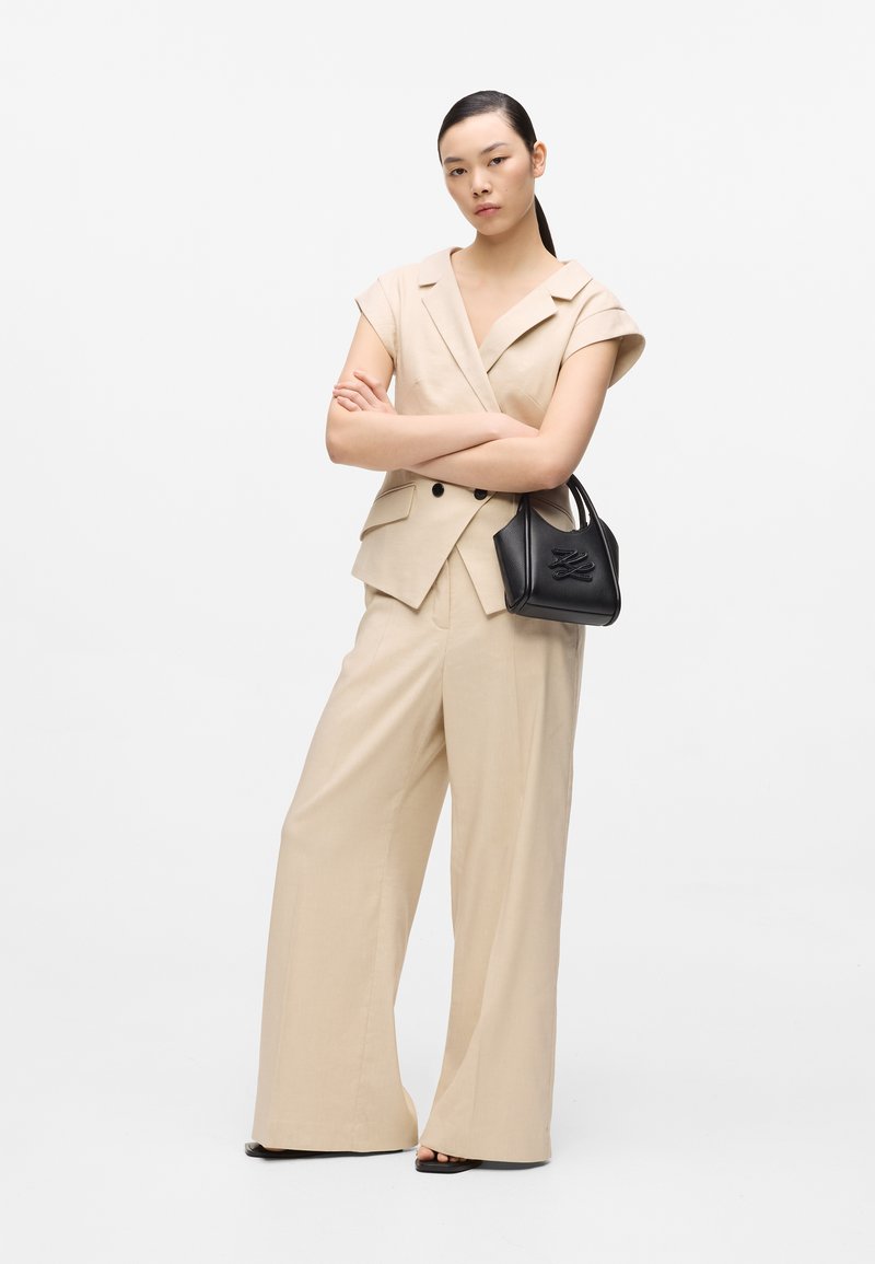 Γυναίκα που φοράει μπεζ αμάνικο σακάκι και παντελόνι φαρδιάς γραμμής, κρατώντας μικρή μαύρη τσάντα, στέκεται με σταυρωμένα τα χέρια μπροστά σε λευκό φόντο.