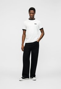 Νεαρός άνδρας που φοράει λευκό μπλουζάκι με μαύρο γιακά και μανσέτες και μικρό μαύρο λογότυπο γυαλιών ηλίου στο αριστερό στήθος, συνδυασμένο με μαύρο παντελόνι.