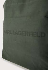 Τσάντα ώμου από καμβά σκούρου πράσινου με κοντά χερούλια και το κείμενο «KARL LAGERFELD» στο κέντρο στην πρόσοψη πάνω σε λευκό φόντο.