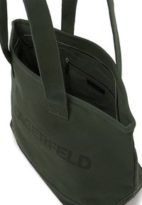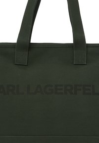 Άνδρας με πράσινο πουκάμισο και μαύρο παντελόνι, κρατώντας μια μεγάλη ελιά τσάντα ώμου με την εκτύπωση "KARL LAGERFELD", στέκεται μπροστά σε λευκό φόντο.